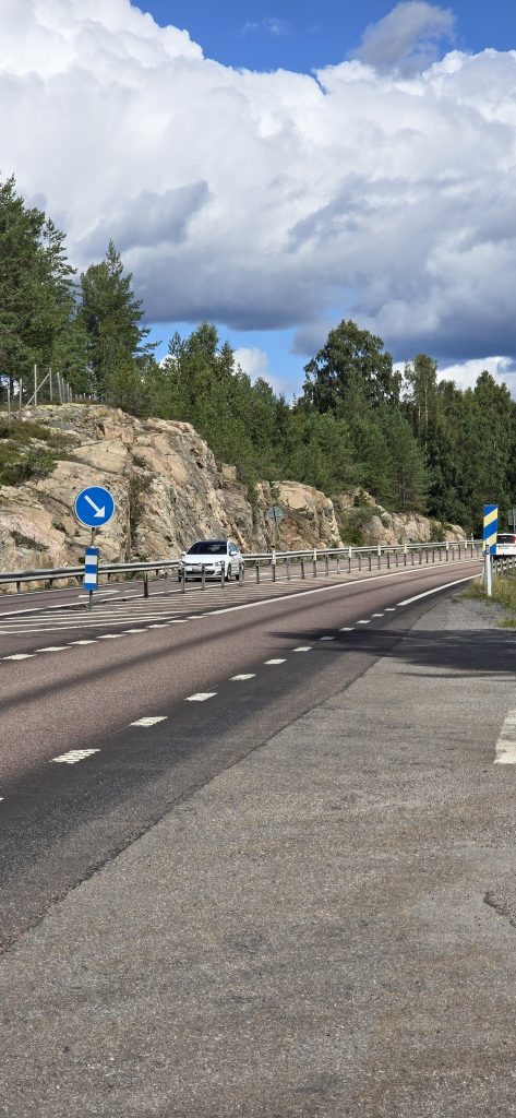 Nach 33km wurde ich jedoch heute für ca 2km auf die E4 geleitet. Ohne Seitenstreifen, mit Mittelleitplanke!! Auf solchen Straßen gilt 110km/h. Überholen mit Abstand, unmöglich!