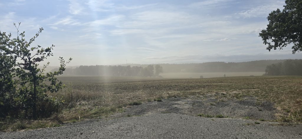 Es  herrscht starker Wind, schräg von vorn, der auf den trockenen Äckern Staub aufwirbelt.