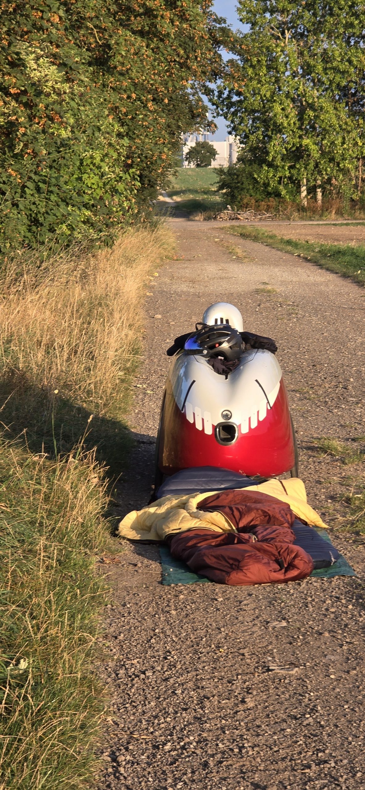 Diese Nacht biwakiere  ich ebenfalls auf einem Feldweg. Bisher legte ich ab Travemünde 343km zurück. Ab km 400  beginnen die kraftraubenden Steigungen des Thüringer Waldes.
