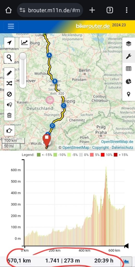 Ich mag nicht auf der gleichen Strecke zurück fahren, wie auf dem Hinweg. Ein paar Strecke auf Bundesstraßen waren extrem unangenehm. Deswegen habe ich eine neue Strecke geroutet. Nach der Ankunft werde ich nachts durchzufahren, so weit es geht. Dafür kann ich den Freitagnachmittagsverkehr vermeiden. Außerdem dürfte es schwierig sein, um 21 Uhr in Travemünde eine Unterkunft zu finden.