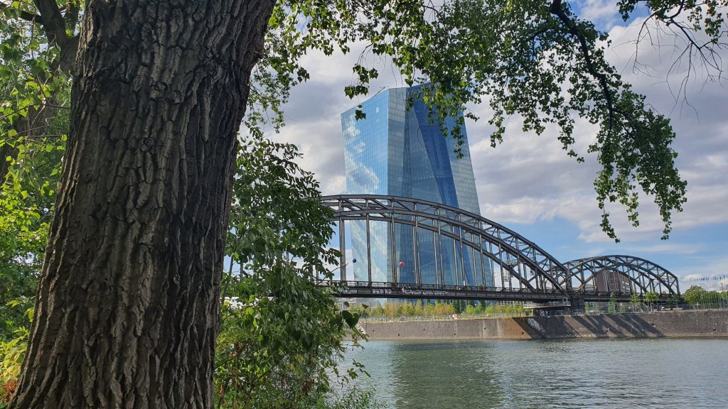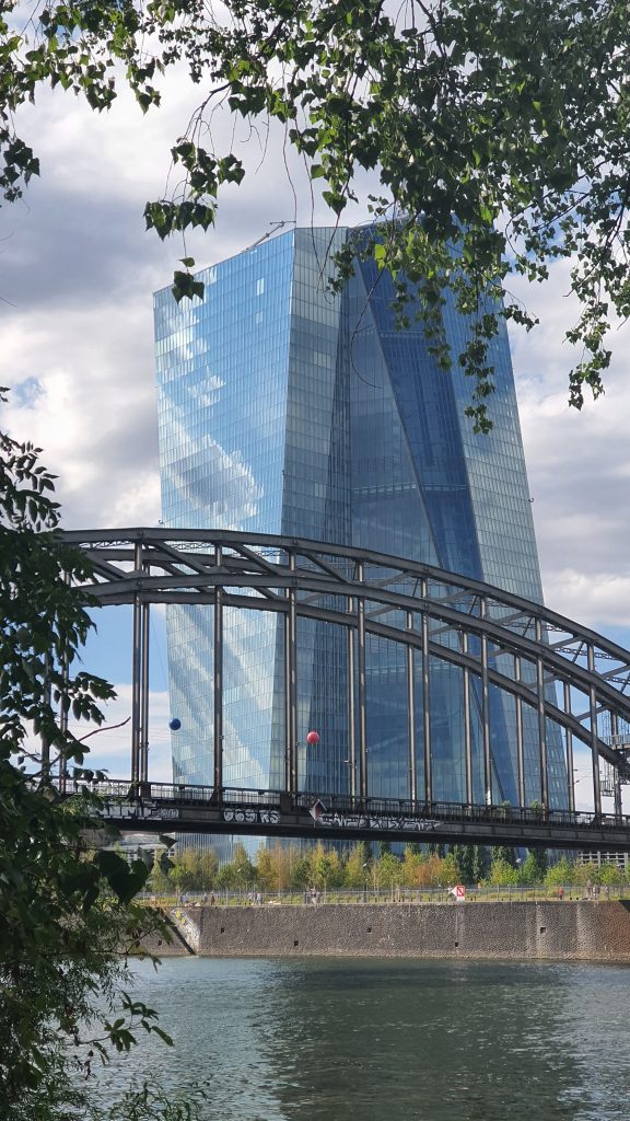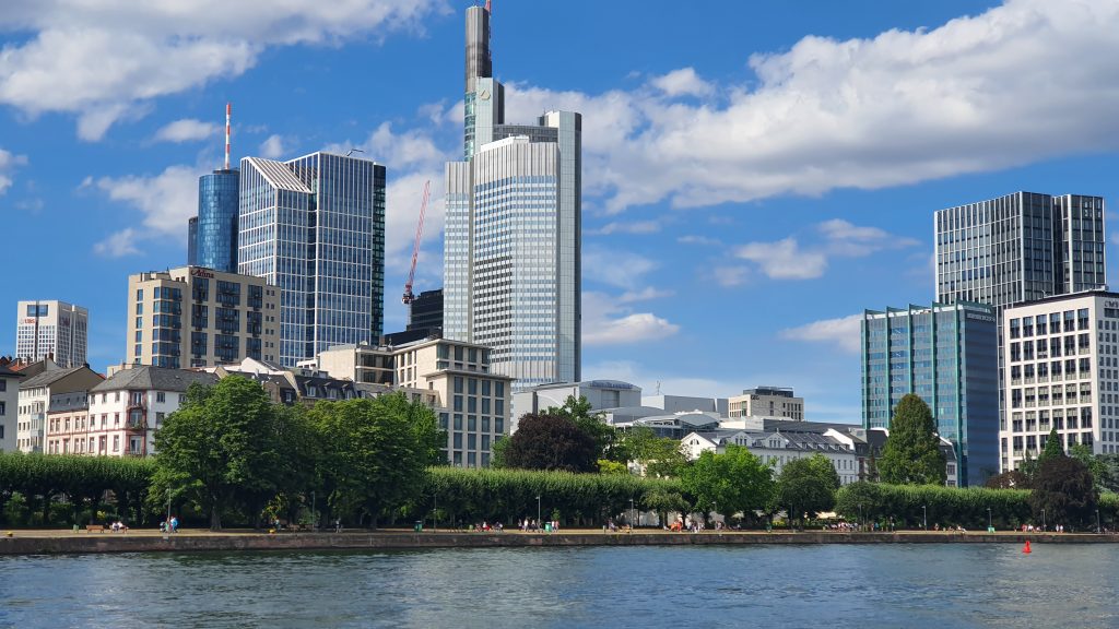 Bei einem Liegerad mit aerodynamischem Heckkoffer ist das kein großes Problem. Mit Tourenrad und seitlich angebrachten Gepäcktaschen sind die Auswirkungen deutlicher spürbar. Vermutlich ist der üblicherweise vorherrschende Westwind Grund dafür, dass die Rentnerscharen meist flussaufwärts fahren.Ich habe den Eindruck, dass 70-80% der Radfahrer, wenn nicht sogar noch mehr, mit Elektro-Unterstützung unterwegs sind. Bei über 60-jährigen ist das für mich durchaus nahvollziehbar und verständlich, bei den Jüngeren wundert es mich allerdings. Jedenfalls kommen mir wahre Heerscharen an E-Bikern entgegen, es ist schließlich Wochenende. – Die Beschaulichkeit der ersten Etappe ist vorüber, auch weil ich mich stark auf den entgegenkommenden Verkehr konzentrieren muss. Zu viele radeln nicht mit der gebotenen Aufmerksamkeit.Die Frankfurter Innenstadt quillt über vor Menschenmassen. – Trotz Corona -. Gemächlich radle ich entlang der Main-Promenade und ziehe dabei die verwunderten Blicke der Passanten auf mich. Das Getümmel genieße ich. Dass ich dabei langsam fahren muss, stört mich nicht.