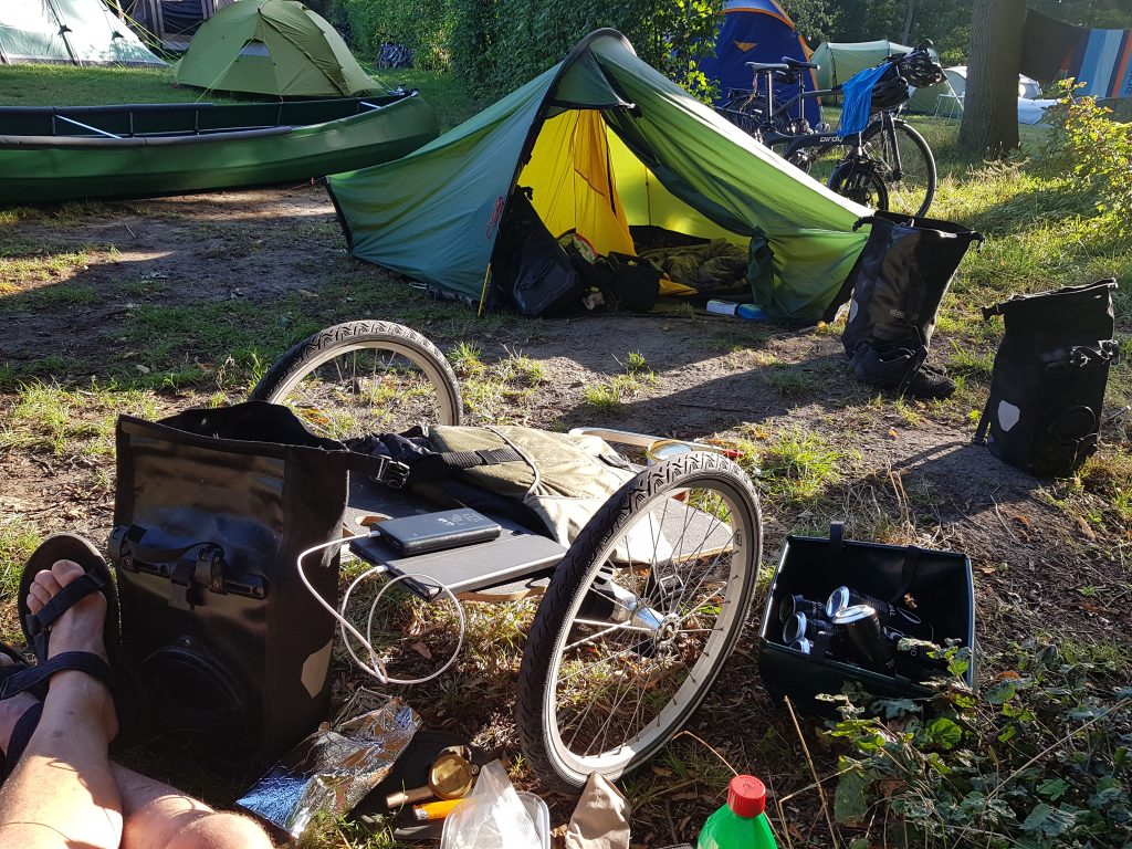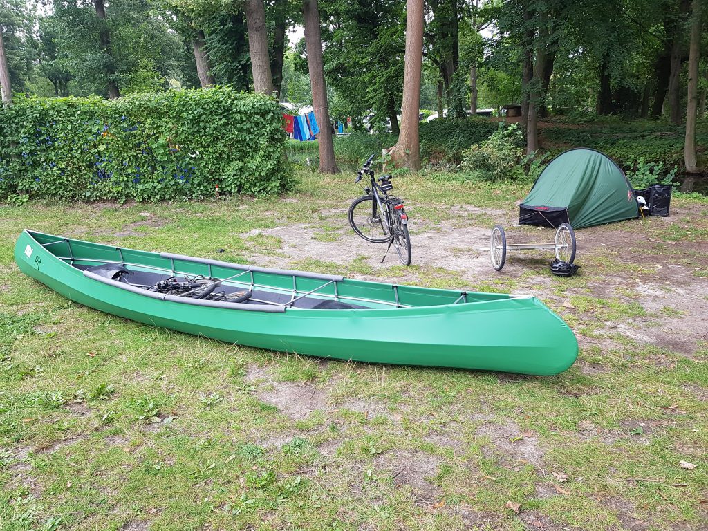 Wir fahren zum Campingplatz, wollen Informationsmaterial beschaffen und fragen bei derGelegenheit nochmals nach, ob vielleicht heute ein Platz für uns frei ist. – Das Glück ist auf unserer Seite! Für Fahrräder und Zelte sind noch wenige (!) Plätze frei! Wir planen eine Nacht zu bleiben, uns zu orientieren und das Boot herzurichten.