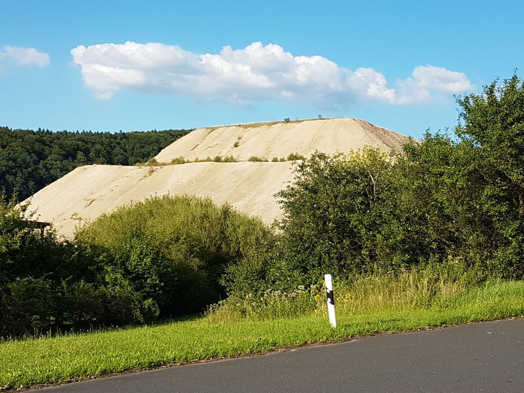 Das Tal wird wesentlich weiter, die Landschaft offener. Erste Bergbau-Halden liegen unmittelbar neben den Straßen. Ich passiere ein Werk der KS-AG (Kali und Salz AG) mit seinem Förderturm.