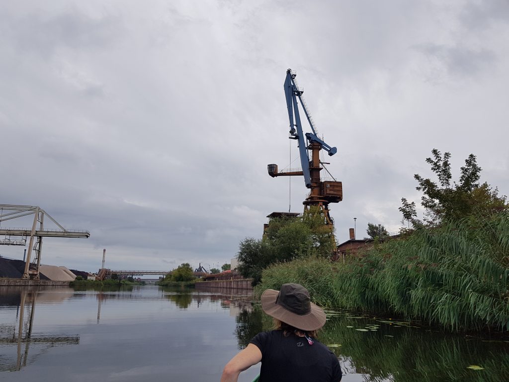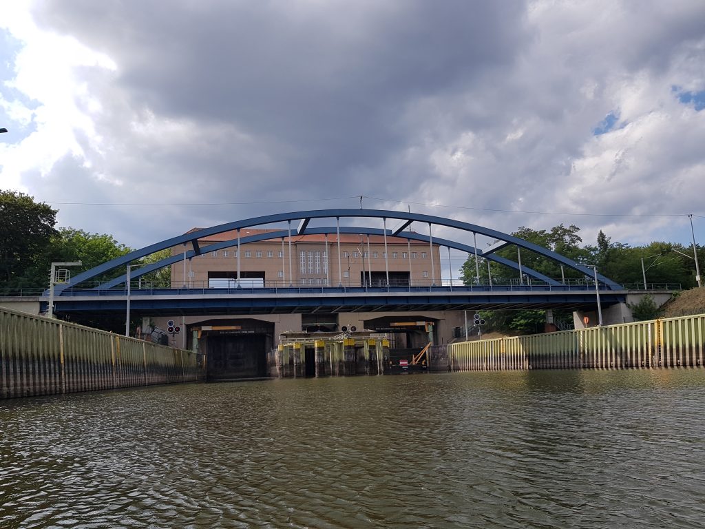 Die Schleuse Eisenhüttenstadt ist eine Doppelschleuse, bei der die 2. Kammer zur Wassereinsparung einen Teil des abzulassenden Wassers aus der 1. Schleuse aufnimmt. Diese ist jedoch im Bau und somit außer Funktion. Des weiteren beträgt die Hubhöhe 14m und die Schleuse selbst ist 130m lang. Das abgelassene Wasser müsste nach der Schleusung mit Kreiselpumpen energieaufwändig wieder in den Spree-Oder-Kanal gepumpt werden. – Ein enormer Ressourceneinsatz, nur um einen kleinen Faltkanadier abzulassen! Das „Mitschleusen“ mit einem großen Schiff oder eine Gruppenschleusung mit anderen Wanderpaddlern, um den Energieeinsatz zu relativieren, ist wegen des ruhenden Schiffsverkehrs auf der Oder ausgeschlossen. Weitere Paddler sind weit und breit nicht sichtbar, die Massen tummeln sich in Lübbenau.