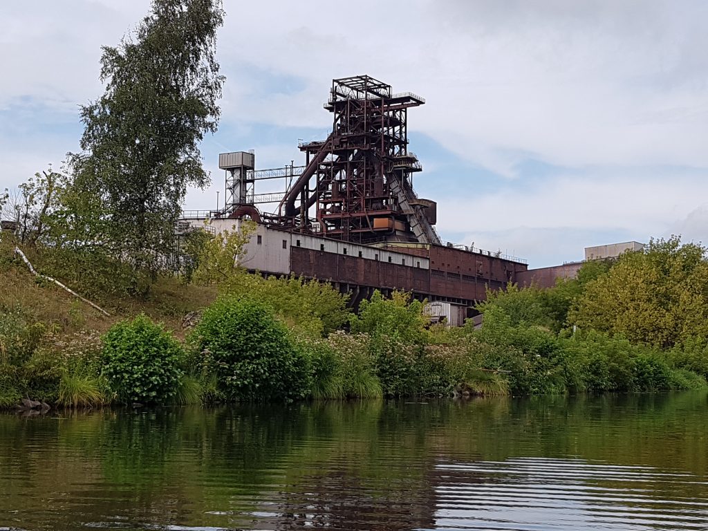 Direkt am Eingang zu Eisenhüttenstadt befinden sich Veraldeanlagen für Koks, Kalk und Eisenerz. Halden türmen sich auf, Förderbänder und Greifer bewegen sich wie von Geisterhand bewegt. Ich zähle insgesamt 5 Hochöfen, die am südlichen Kanal des Ufers aufgebaut sind. Weitere Industrieanlagen, aber auch Wohngebäude und Parkanlagen folgen, bis wir die Schleuse Eisenhüttenstadt erreichen.