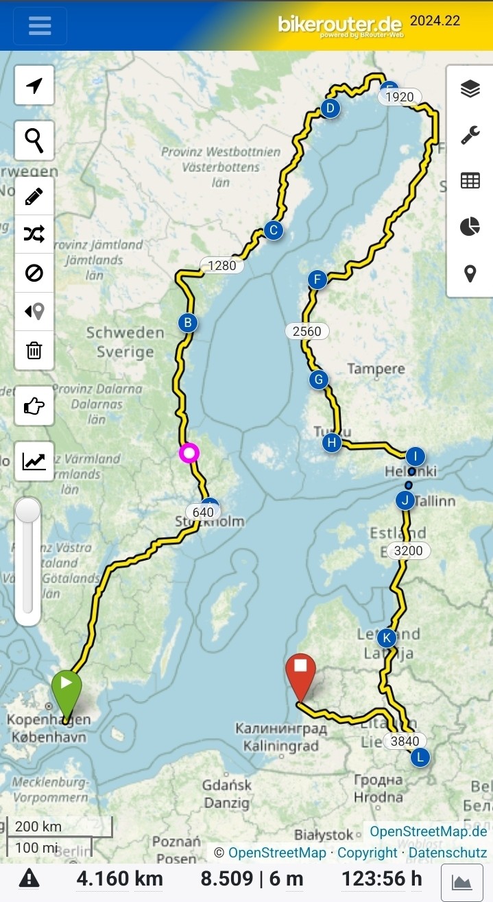 Zunächst täglich (nur) 150km eingeplant. Will auch noch einen Tag Freunde besuchen. Wie es mit dem vielen Gepäck und robusteren Reifen „läuft“ weiß ich noch nicht. Auch nicht, was meine alten, lädierten Knochen zu der Aktion sagen werden. In Summe könnten es bis zu 5.500km rund um die Ostsee werden. Aber schauen wir mal -.
