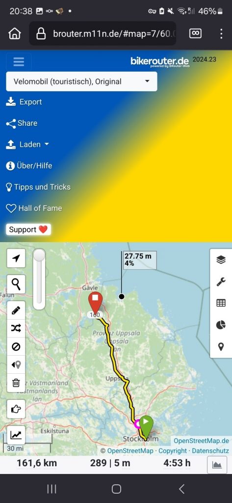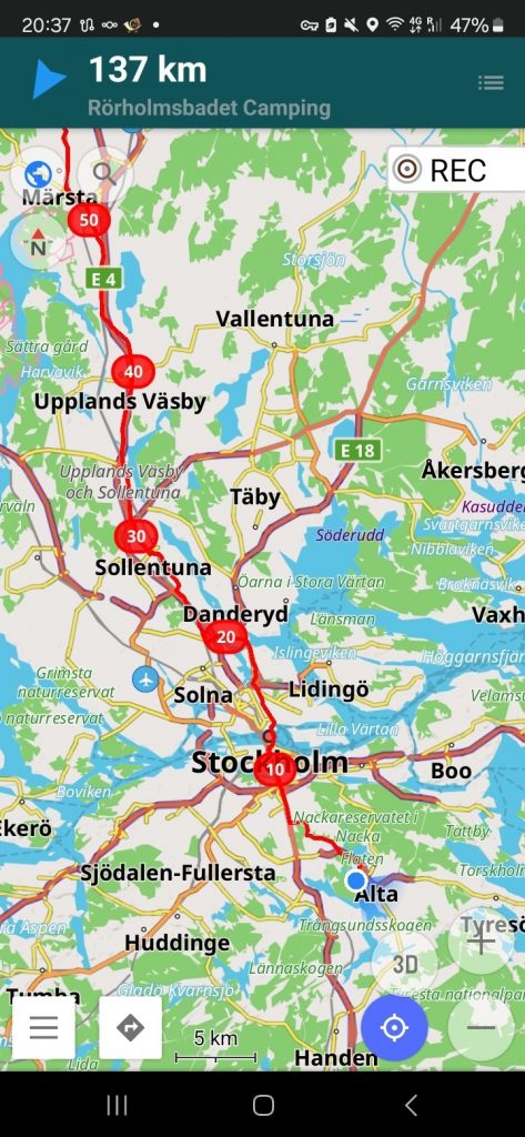 Die Lage der Campingplätze gibt meine Etappenlänge vor. Für morgen habe ich eine 160km Etappe geplant. Dabei muss ich kraftraubend Stockholm und Uppsala durchqueren. Schaumama.